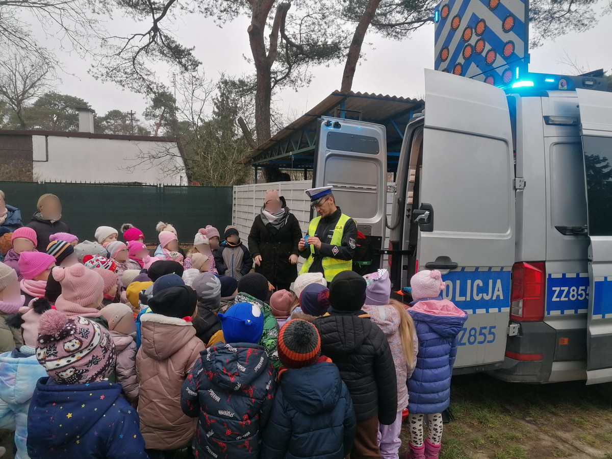 Celem wizyty było przybliżenie dzieciom zasad bezpiecznego poruszania się po drogach, a także kształtowanie świadomych i odpowiedzialnych postaw już od najmłodszych lat. Policjanci w przystępny i angażujący sposób opowiadali o tym, jak prawidłowo przechodzić przez jezdnię, dlaczego należy nosić elementy odblaskowe oraz jak zachowywać się w pobliżu drogi i podczas podróży samochodem.