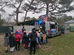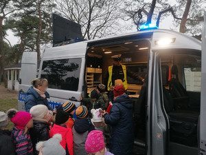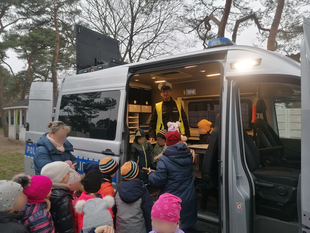 Dużym zainteresowaniem przedszkolaków cieszył się również pokaz specjalistycznego pojazdu ruchu drogowego APRD, który funkcjonariusze zaprezentowali na placu przed budynkiem. Dzieci mogły zobaczyć z bliska wyposażenie radiowozu, posłuchać sygnałów dźwiękowych oraz dowiedzieć się, do jakich działań wykorzystywany jest taki pojazd.
