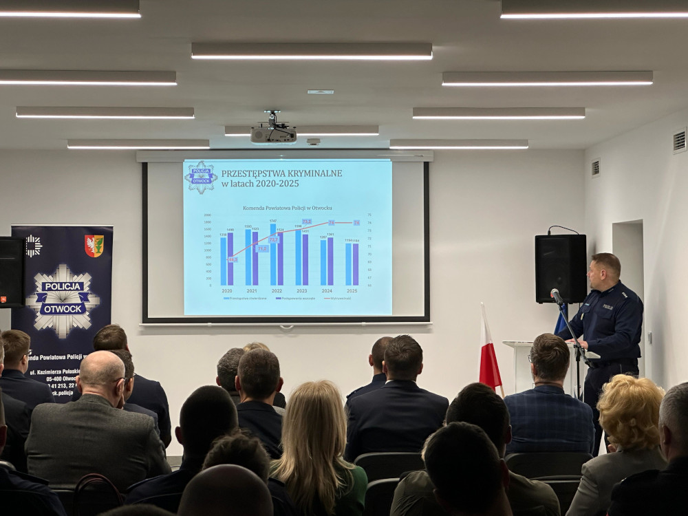 Na sali konferencyjnej Komendy Powiatowej Policji w Otwocku odbyła się odprawa podsumowująca działania funkcjonariuszy w 2025 roku. Oprócz całej kadry kierowniczej, wzięli w niej udział licznie przybyli goście - Prokurator Rejonowy w Otwocku wraz z Zastępcą, przedstawiciele władz samorządowych oraz Komendanci i Dyrektorzy zaprzyjaźnionych służb i instytucji. Zaprezentowane dane wskazywały wysokie wskaźniki wykrywalności w wielu kategoriach, które to uplasowały otwocką policję na pierwszym miejscu wśród komend rejonowych i powiatowych garnizonu stołecznego.