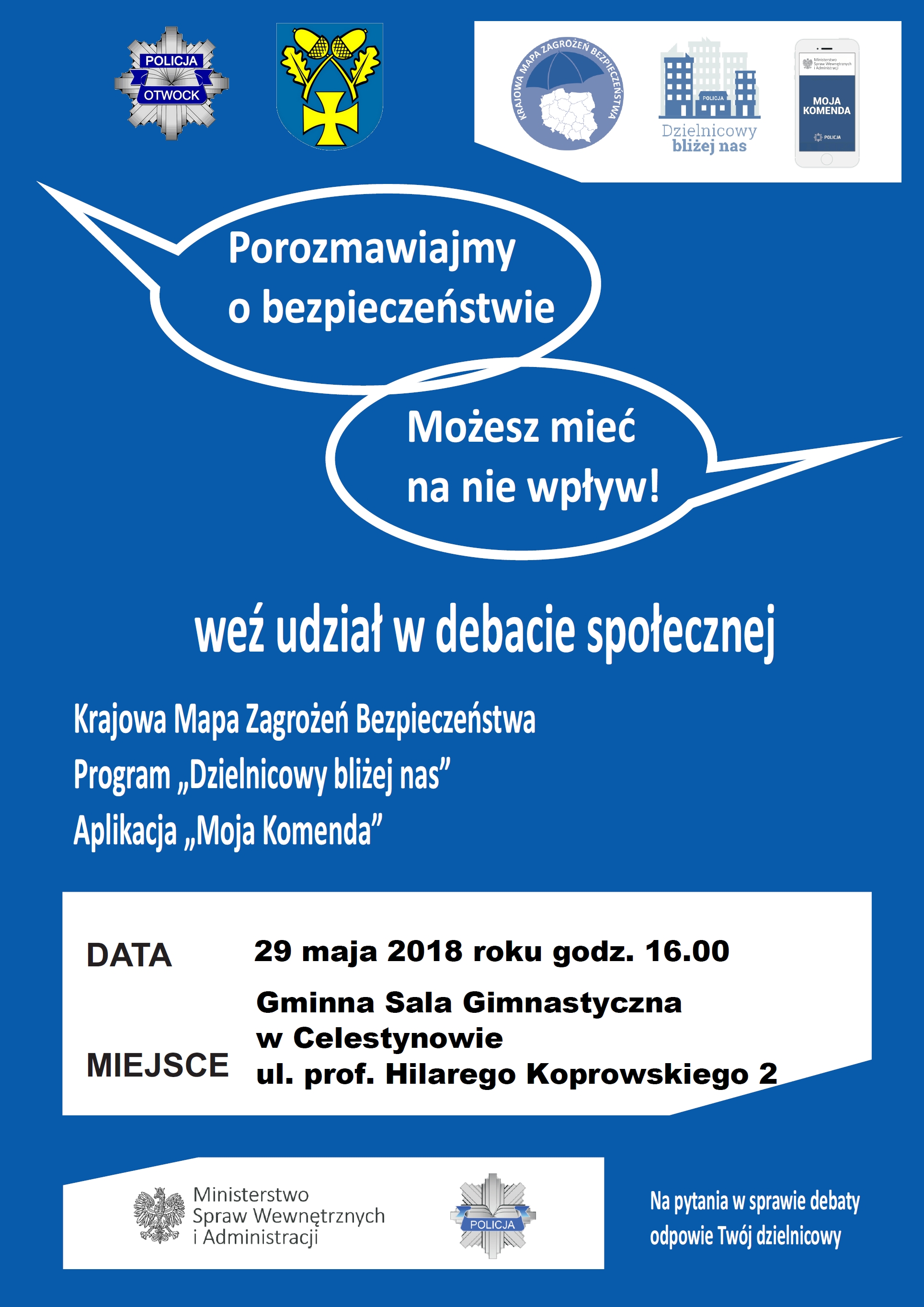 - 29 maja 2018 roku w godzinach 16.00-18.00, odbędzie się debata z udziałem samorządowców, przedstawicieli służb oraz instytucji, a także mieszkańców gminy Celestynów, w Gminnej Sali Gimnastycznej w Celestynowie, przy ul. prof. Hilarego Koprowskiego 2. (realizuje KP Karczew/PP Celestynów).