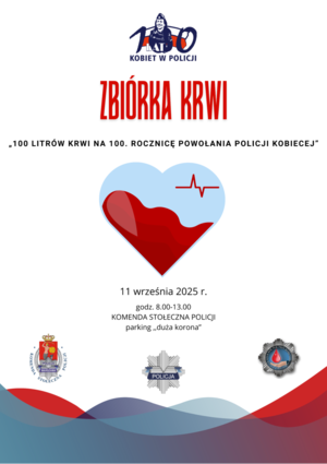 W 2025 roku obchodzimy wyjątkową rocznicę tj. 100-lecie Powołania Policji Kobiecej. To szczególny czas, w którym chcemy nie tylko przypominać o historii i roli kobiet w naszej formacji, ale również podejmować działania, które realnie wpływają na życie i zdrowie obywateli. Z tej okazji Komenda Główna Policji zaprasza wszystkie jednostki Policji z całej Polski do organizowania zbiórek krwi. Niech nasze hasło POMAGAMY I CHRONIMY tym razem ma wydźwięk w zebranych litrach tej życiodajnej substancji.